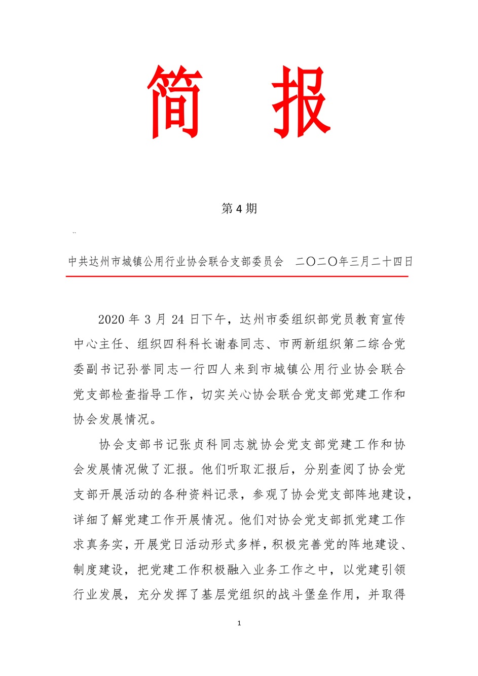 中共達(dá)州市城鎮(zhèn)公用行業(yè)協(xié)會聯(lián)合支部委員會2020年第四期簡報(bào)
