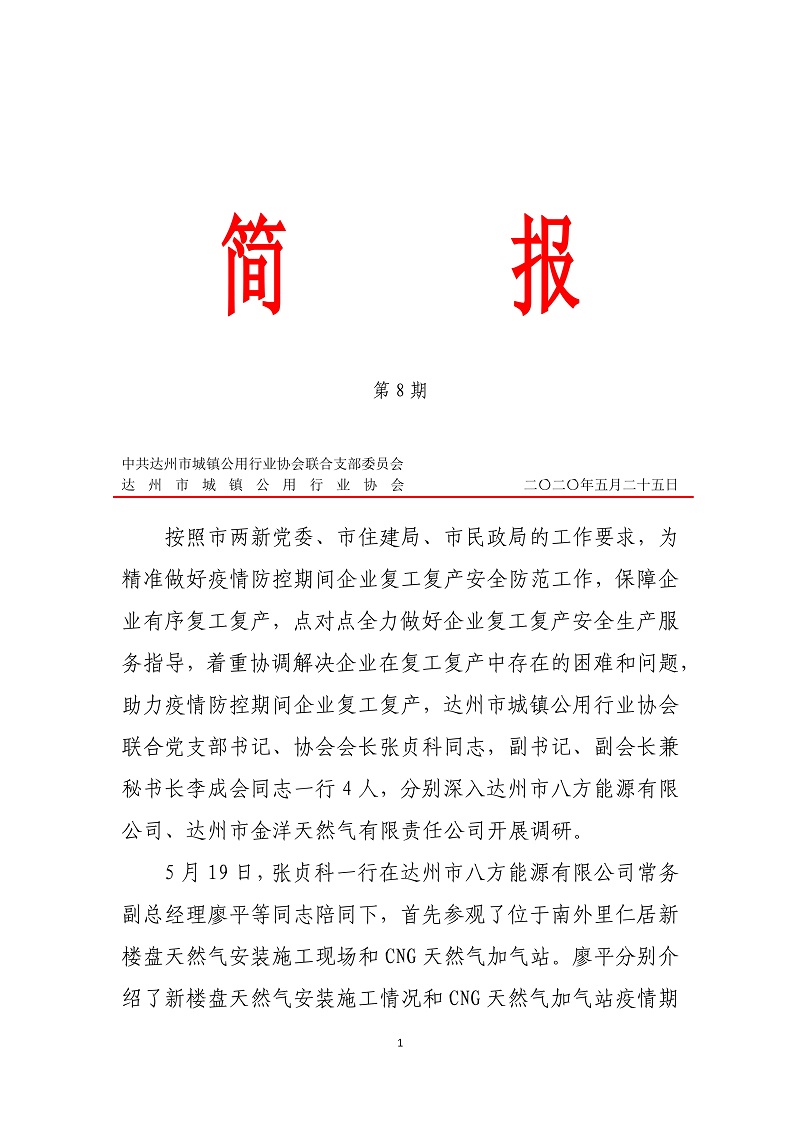 中共達(dá)州市城鎮(zhèn)公用行業(yè)協(xié)會聯(lián)合支部委員會2020年第八期簡報(bào)