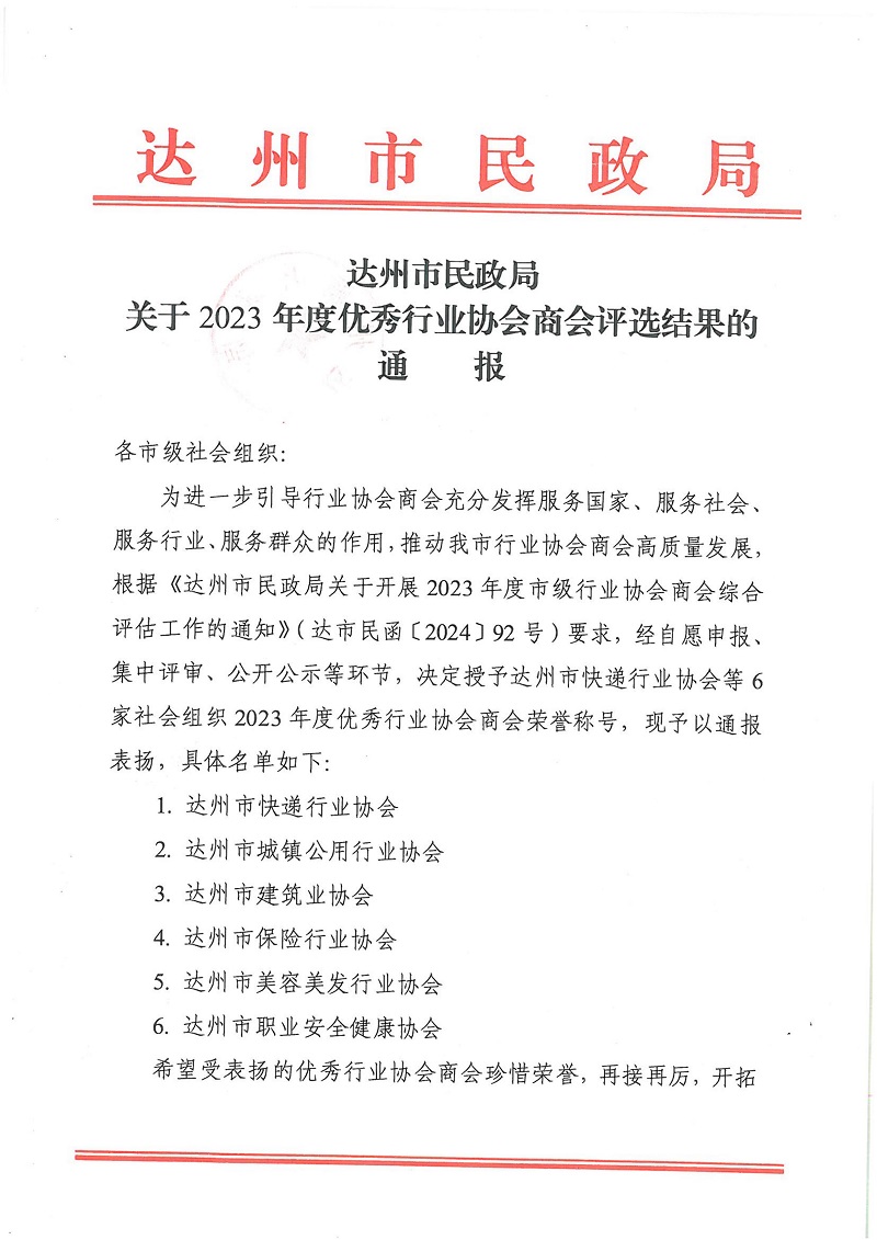 達(dá)州市民政局關(guān)于2023年度優(yōu)秀行業(yè)協(xié)會(huì)商會(huì)評(píng)選結(jié)果的通報(bào)