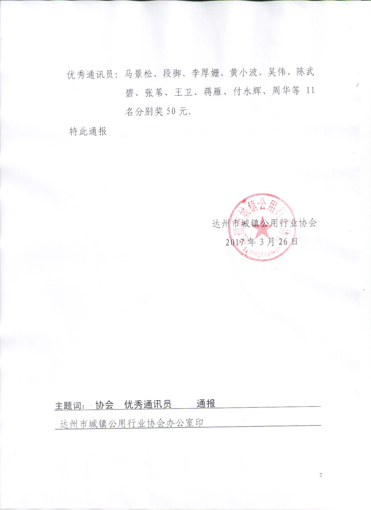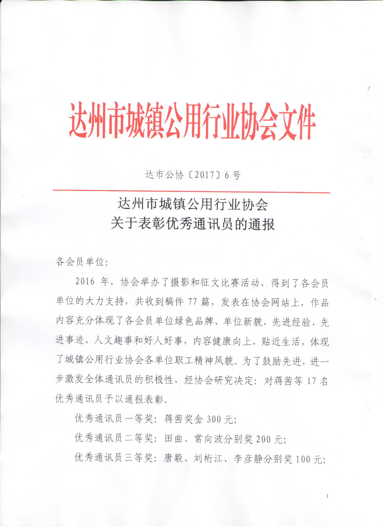 達州市城鎮(zhèn)公用行業(yè)協會關于表彰優(yōu)秀通訊員的通報
