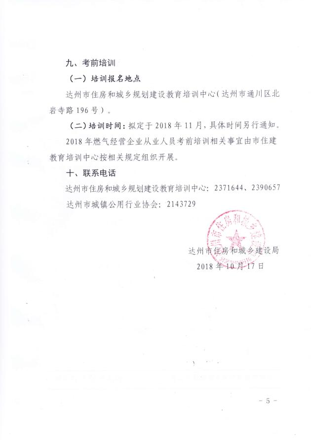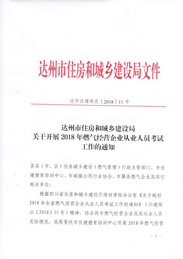 達(dá)州市住建局關(guān)于開(kāi)展2018年燃?xì)饨?jīng)營(yíng)企業(yè)從業(yè)人員考試工作的通知