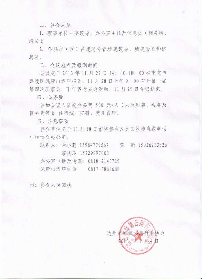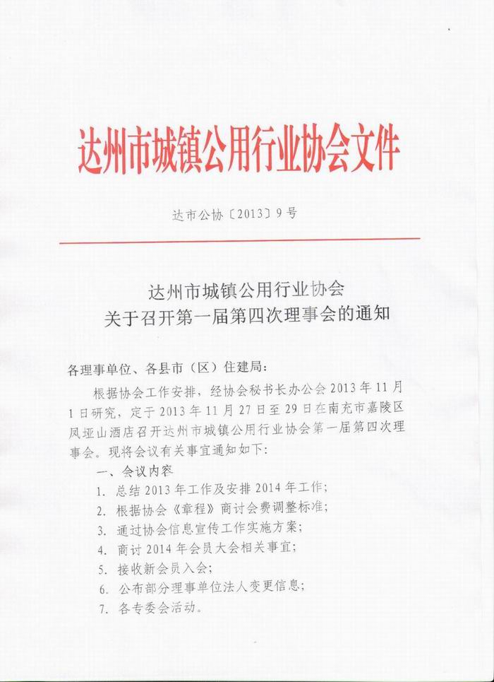 根據(jù)協(xié)會(huì)工作安排,經(jīng)協(xié)會(huì)秘書長辦公會(huì)2013年11月1日研究,定于2013年11月27日至29日在南充市嘉陵區(qū)鳳埡山酒店召開達(dá)州市城鎮(zhèn)公用行業(yè)協(xié)會(huì)第一屆第四次理事會(huì)。現(xiàn)將會(huì)議有關(guān)事宜通知如下: