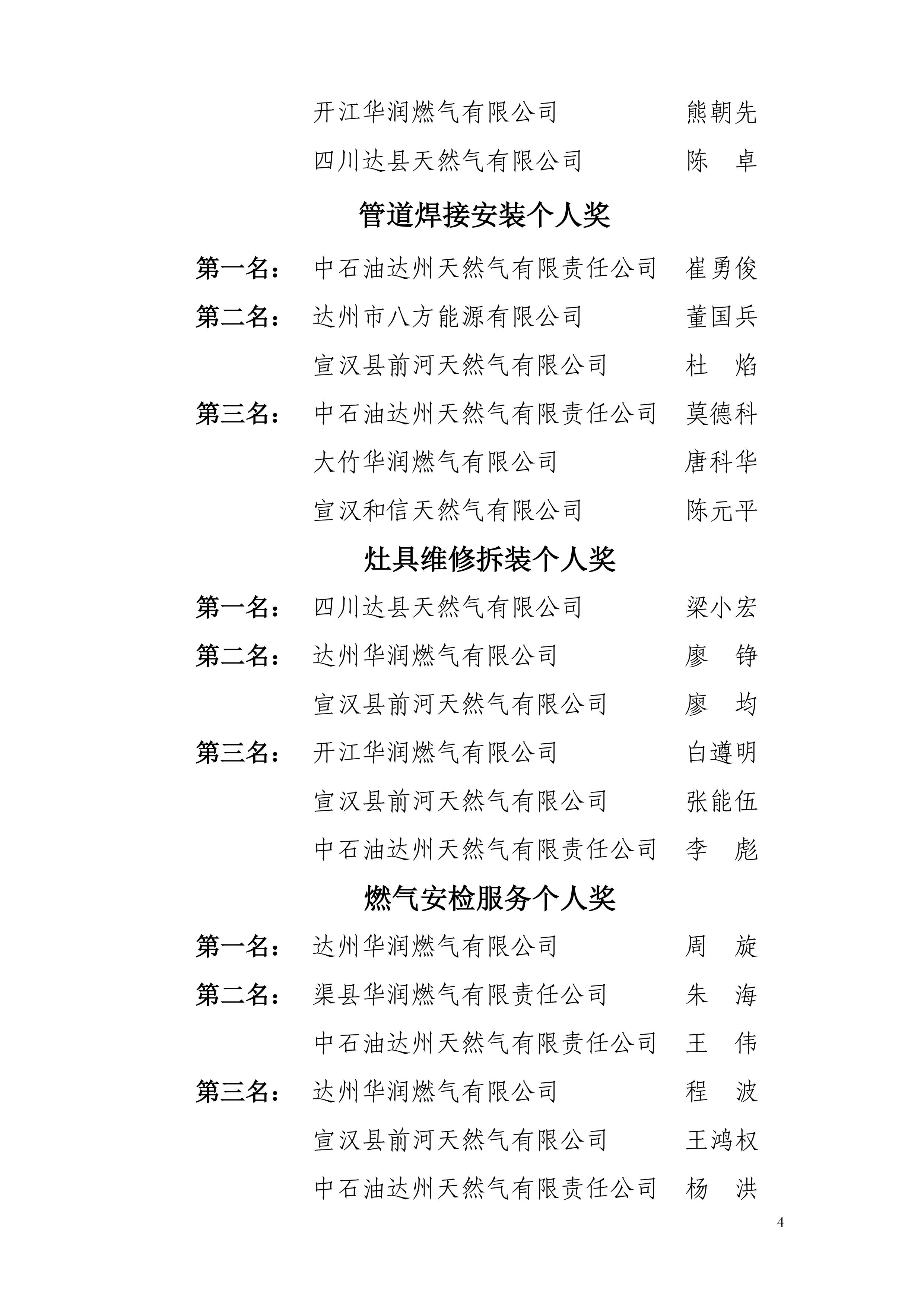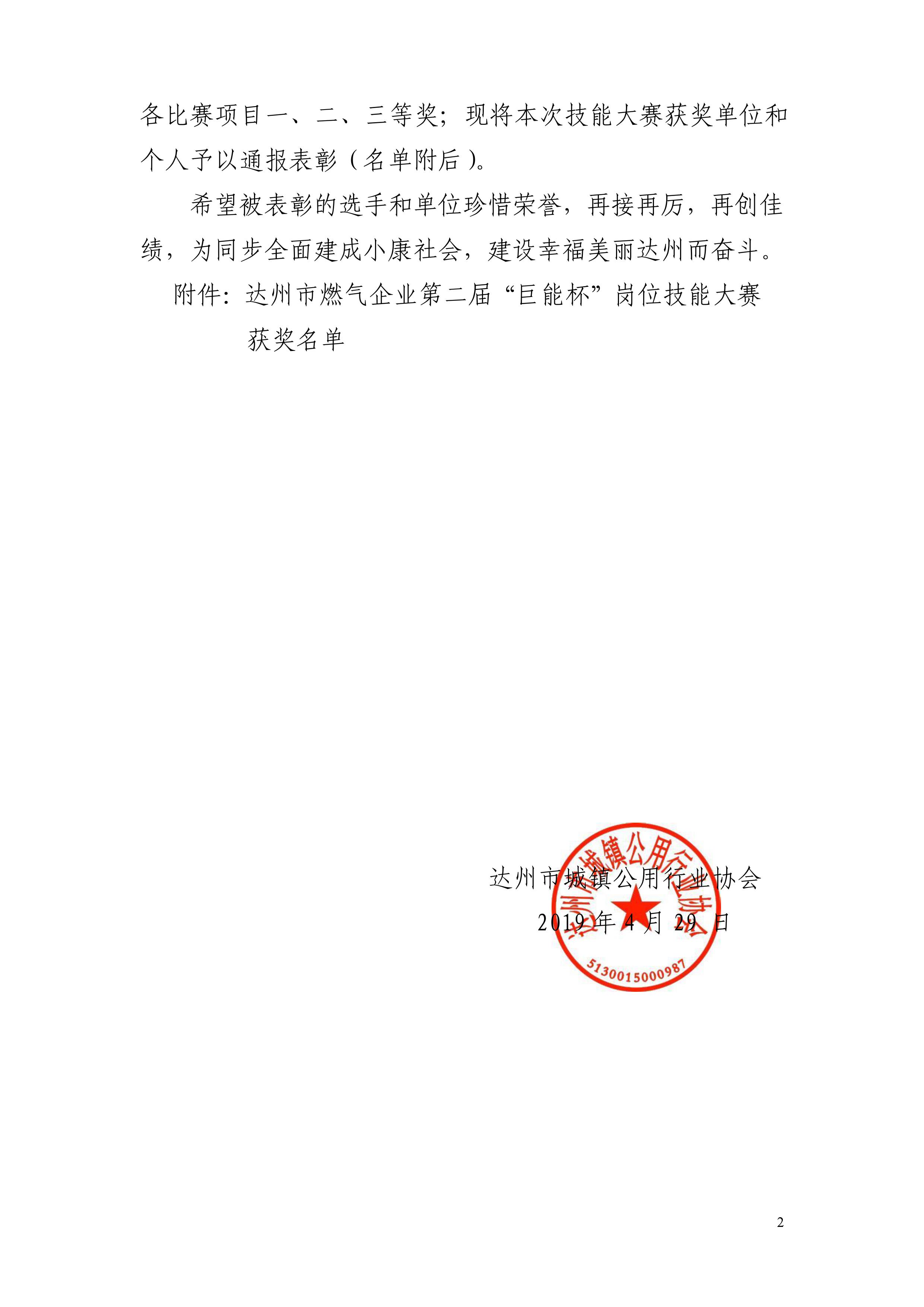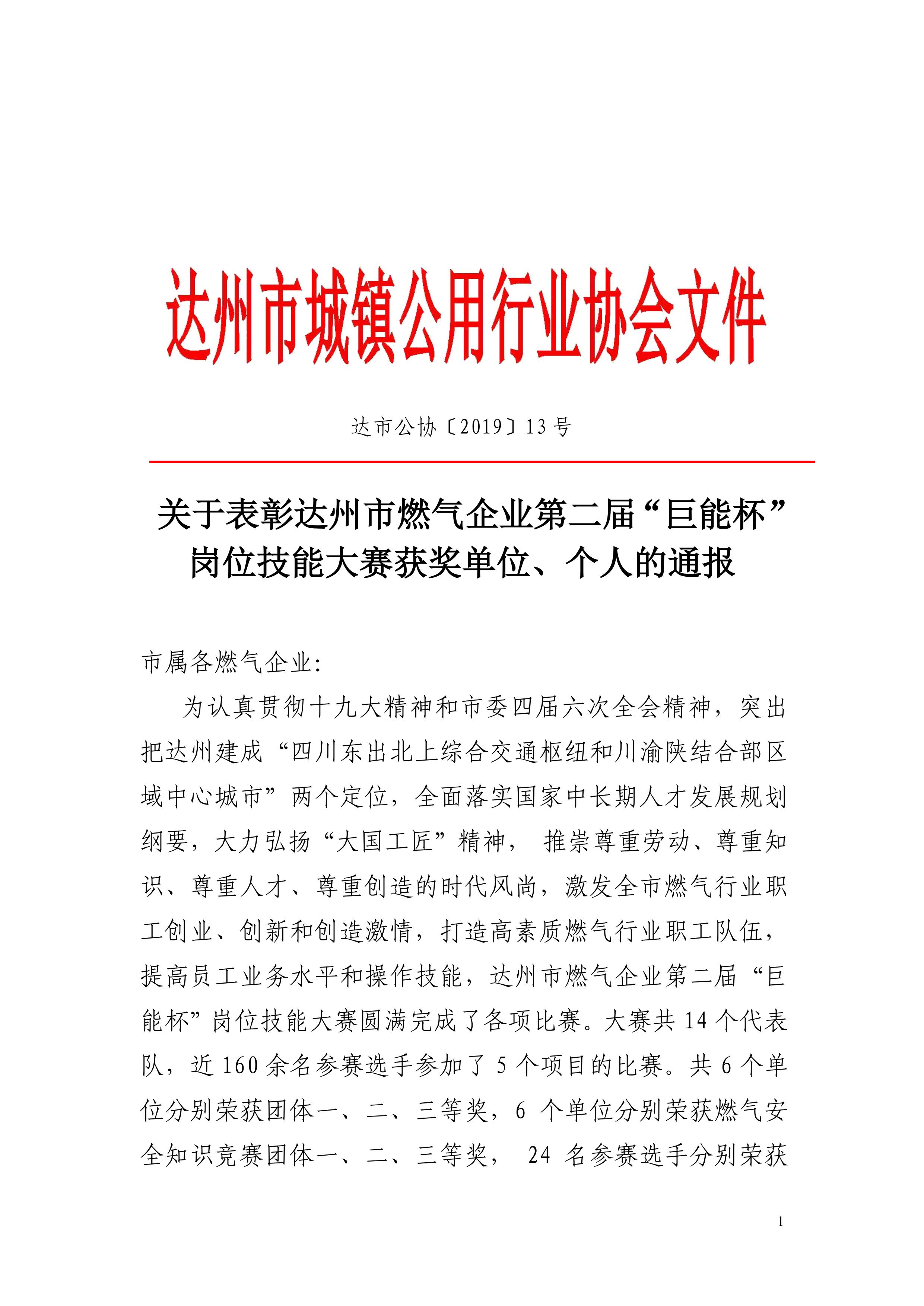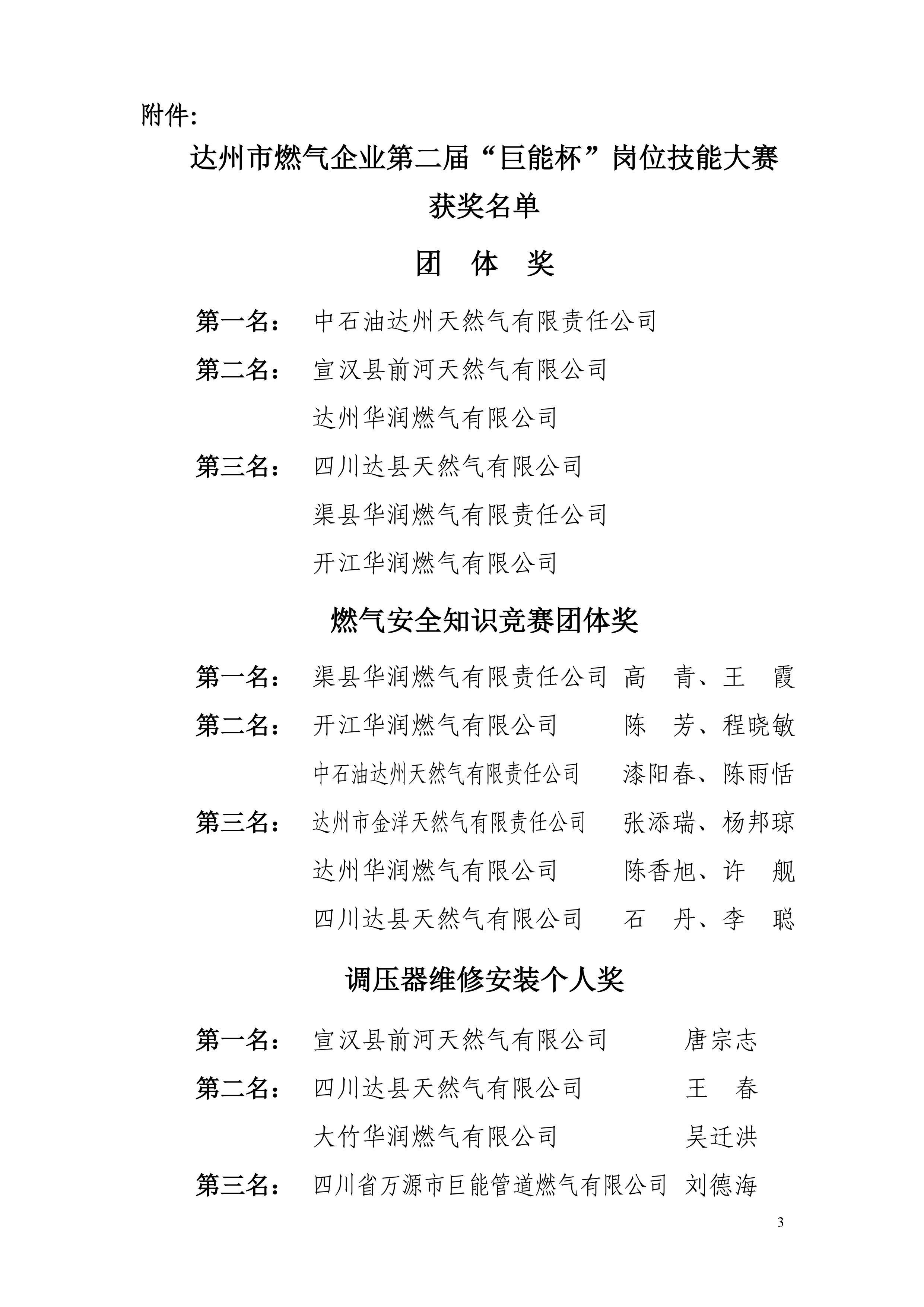 關(guān)于表彰達(dá)州市燃?xì)馄髽I(yè)第二屆“巨能杯”崗位技能大賽獲獎單位、個人的通報