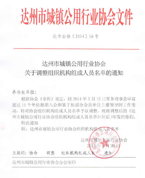 達州市城鎮(zhèn)公用行業(yè)協(xié)會關(guān)于調(diào)整組織機構(gòu)組成人員名單的通知